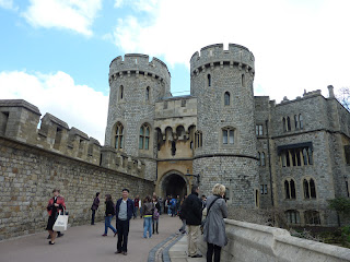 We admire the (original) Norman gate with portcullis and murder holes. If someone tried to breach the castle the portcullis would be closed and various murderous substances tipped down the murder holes to deal with the invaders. Perhaps hot water, molten lead, rocks but contrary to popular perception never hot oil. Oil was far too expensive for that purpose. There have been four attacks on Windsor Castle over its history, but it has never been taken by force.